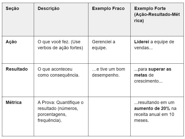 Linguagem Ativa, Não Passiva: O que distingue um currículo "bom" de um currículo "Harvard" é não apenas descrever o que você fez, mas quantificar o valor que você entregou.