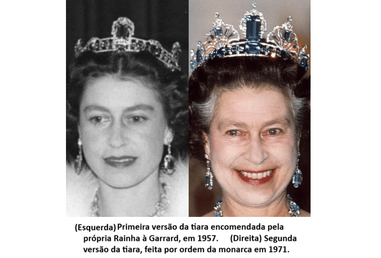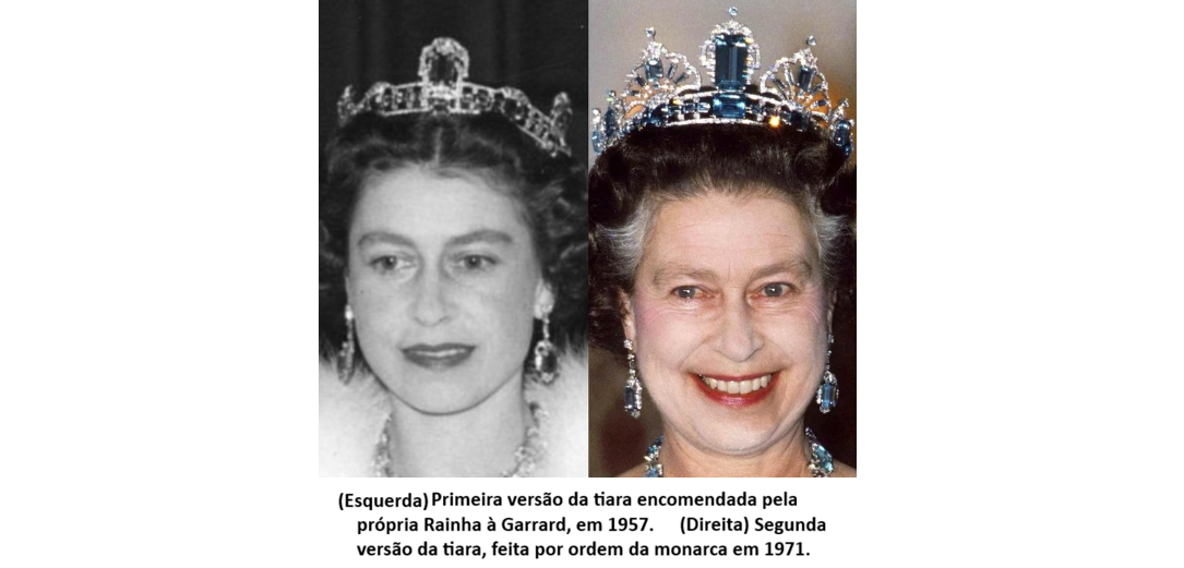 A Reformulação de 1971: Com o passar dos anos, o Brasil continuou presenteando a Rainha com mais gemas (uma pulseira e um broche em 1958, e mais pedras soltas em 1968, durante sua visita oficial ao país). A Rainha então decidiu que a tiara precisava de mais imponência. Ela substituiu os três elementos frontais por quatro novos ornamentos maiores, criando a silhueta opulenta que conhecemos hoje.